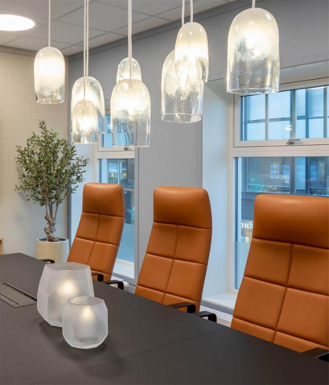Prosjektet omfater flere elementer for spesialdesign. Pendlene på møterommene og i spisestuen ble til i en prosess med den lokale glasshyta. Sammen med Inventum Tromsøs interiørarkitekt ble lampene designet til prosjektets interiørkonsept og gir en helt spesiell atmosfære og sjel til rommene.