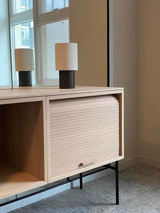 Lokalet består utelukkende av high-end møbler og kontorene er ingen unntak. Med generøs arbeidsstol, bordunderstell med moderne detaljer, buede PC-skjermer og skjermvegger av høyakustisk verdi er dete et delikat kontordesign av høy kvalitet. Det er valgt teppegulv for et lunt innemiljø som også demper trinnlyden og beige toner for et rolig og tidløst utrykk. Møteromsmøbler inne på kontorer er loungeinspirert for å skape en komfortabel atmosfære.